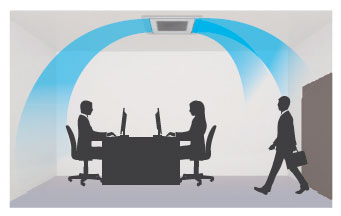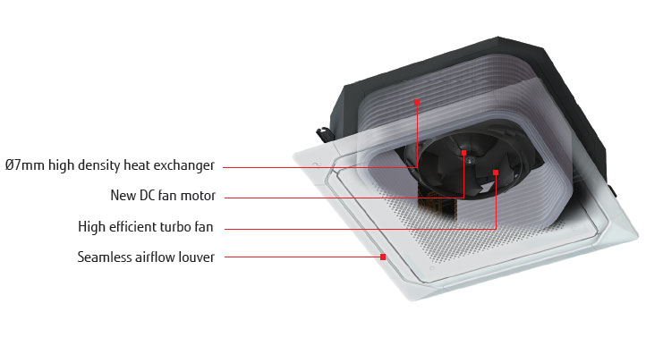 New Cassette type realizes Circular Flow to blow large airflow in 360º direction by mounting high performance DC fan motor, new turbo fan and unique seamless airflow louver design.