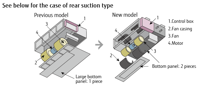 Structural improvement is attained by making the bottom panel two pieces, front and rear. The internal fan casing is also manufactured in two pieces, namely upper and lower. The maintenance of the motor and fan can be easily carried out by removing the rear panel and the lower part of the casing while leaving the main chassis installed.