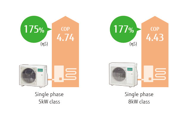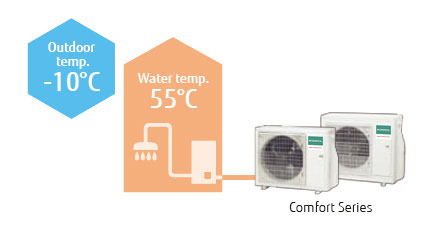 The temperature of leaving water can go up to 55°C without a backup heater. Hot water can be continually supplied throughout the house, even when the outdoor temperature drops to -10°C.