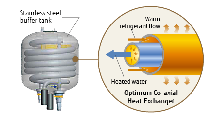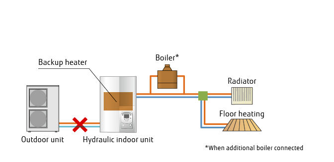 If an outdoor unit fails to operate, a built-in backup heater or an external boiler is activated to supply hot water to the house uninterrupted.