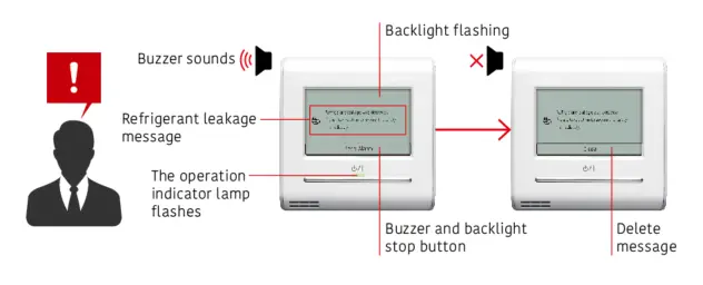 In the event of a refrigerant leak, the following actions will clearly notify the user: