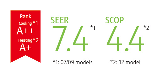 Outstanding energy efficiency is achieved by using a high-efficiency lamda heat exchanger, a large crossflow fan, and R32 refrigerant.
