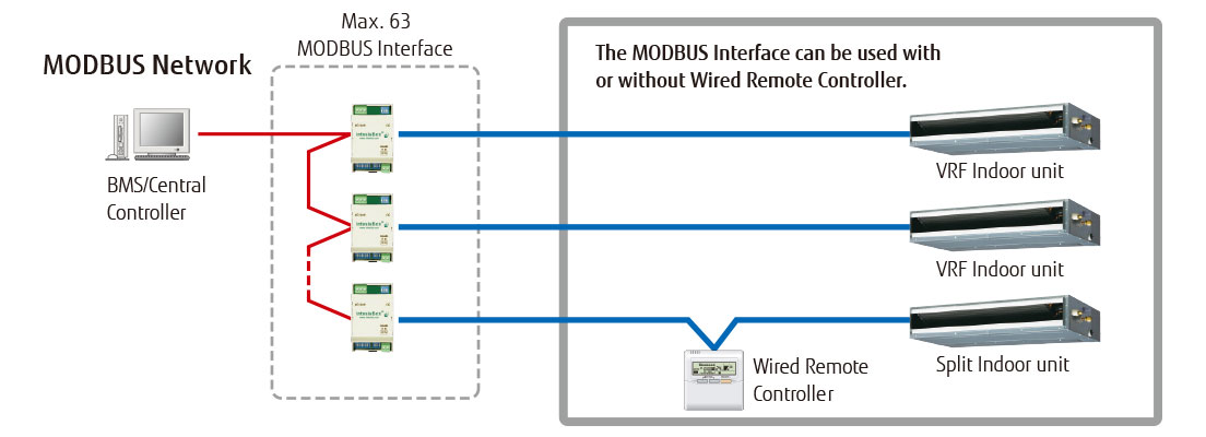 - The MODBUS® Interface enables central monitoring and control of air conditioners from BMS.