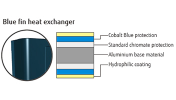 The corrosion-resistant blue fin treatment is applied to the heat exchanger of the outdoor unit.