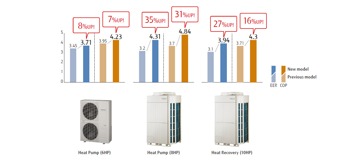 Significantly greater efficiency is achieved by the use of a DC twin-rotary compressor, inverter technology, and a large heat exchanger.