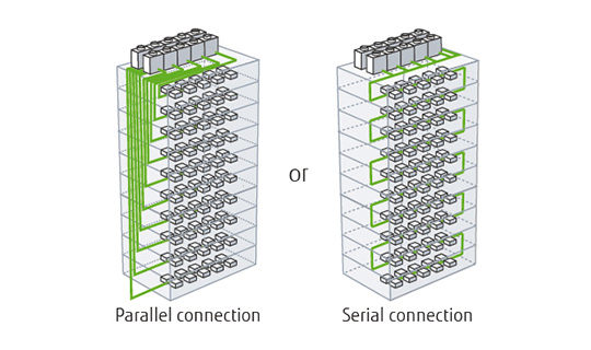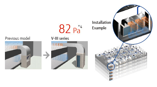 A condenser hood can be connected to the outdoor unit to achieve a standard static pressure of 82 Pa*4. This allows the outdoor unit to be installed in an equipment room in a high-rise building.