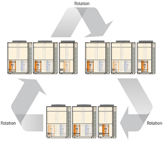 Compressors are set to start operating in rotational order to equalize the cumulative running time of each unit.