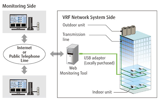 The VRF network system operating in a building can be monitored in real time via the Internet.