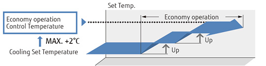 Economy mode can be set by a remote controller. The previously set temperature is overridden step by step automatically over time.