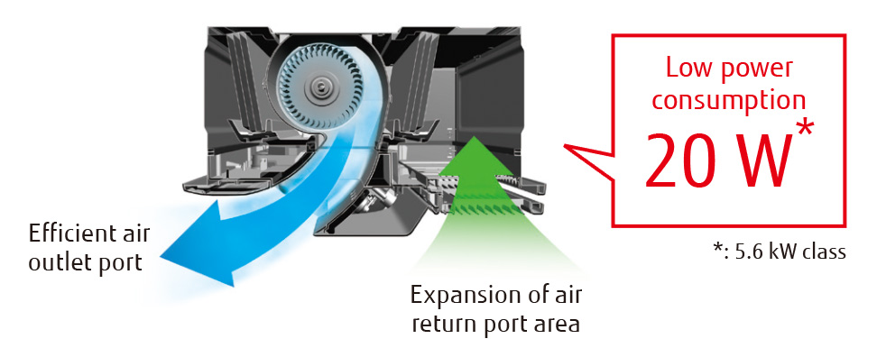The structural design to take in a larger volume of air and blow air out more smoothly reduces air blowing loss and achieves best-in-class energy-saving performance.