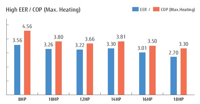 Top class high EER/COP(Max. Heating) is achieved for all models by a large heat exchanger, highly efficient Scroll compressor.