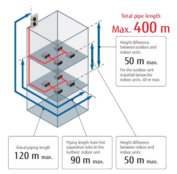 Our advanced refrigerant control technology allows us to achieve a total refrigerant piping length of 400 m. This opens up new possibilities in system design.