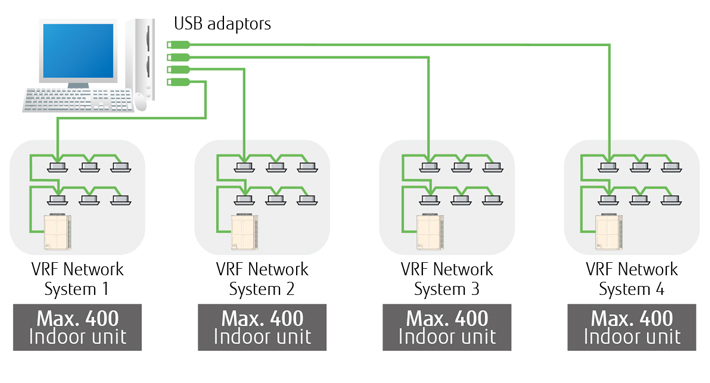 Up to 4 USB adapters can be connected to a PC, enabling the monitoring of up to 1,600 indoor units. Suitable for use in a large-scale building or a hotel.