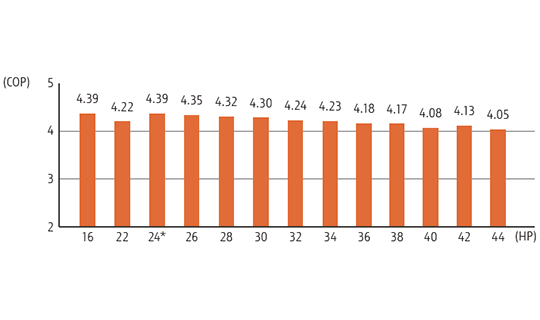 Top class high COP(Max. Heating) is achieved for all combinations by our unique heat exchanger structure, high efficient DC twin compressor, and our own technologies.