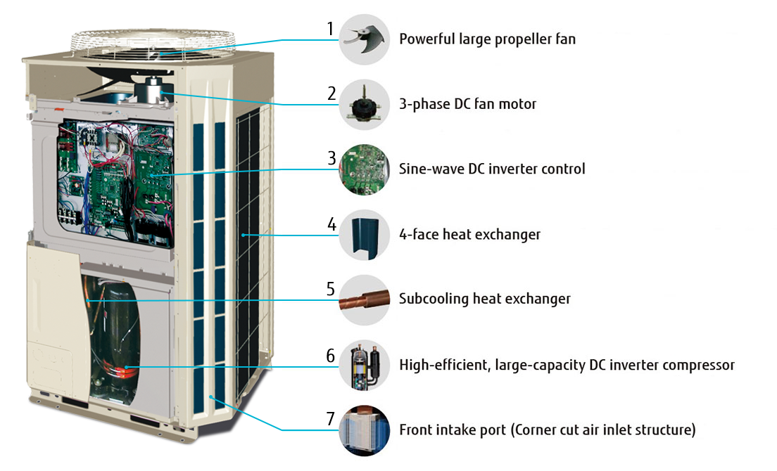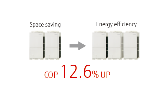 When multiple outdoor units are installed, the uniquely shaped front intake improves the airflow into the heat exchanger.