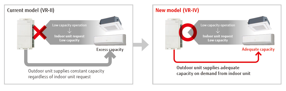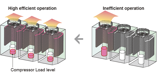 When multiple outdoor units are connected a sophisticated operation is performed by each compressor. Rather than running one compressor at full load and distributing refrigerant to one heat exchanger, this control method operates all compressors at part load and distributes refrigerant to all of the heat exchangers which allows for the overall system efficiency to be improved.