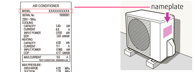 The model name is shown on the nameplate on the side of an outdoor unit.