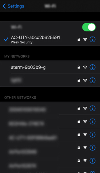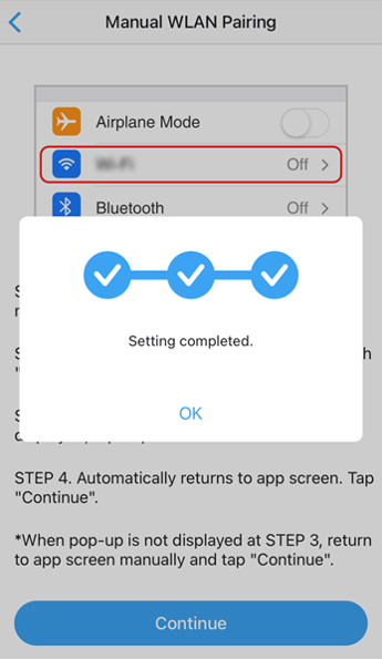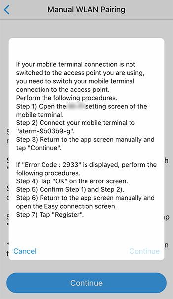 When you start to manually connect a WLAN adapter using your smartphone running iOS 14 or tablet running iPad OS 14, a message will pop up on the screen of your smartphone or tablet as shown below.