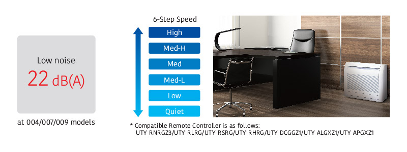 Quiet operation is realized by 6 fan speed control. (via 2 wire controller)