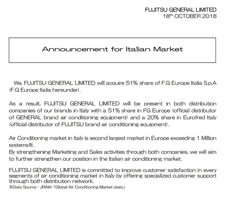 Rafforzando le attività di marketing e vendita attraverso entrambe le società, mireremo a rafforzare ulteriormente la nostra posizione nel mercato italiano della climatizzazione. FUJITSU GENERAL LIMITED si impegna a migliorare la soddisfazione dei clienti in tutti i segmenti del mercato della climatizzazione in Italia offrendo assistenza specializzata attraverso entrambe le reti di distribuzione.
