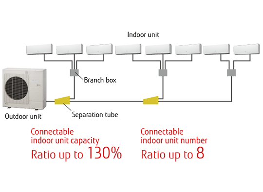 È possibile collegare fino a 8 unità interne a una singola unità esterna. La percentuale massima di potenza complessiva delle unità interne collegabili è del 130%. Questa flessibilità soddisfa le esigenze di climatizzazione in un'ampia gamma di planimetrie.
