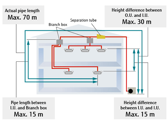 Le unità interne possono essere installate in appartamenti o edifici commerciali a più piani utilizzando lunghe tubazioni estese da un'unità esterna.