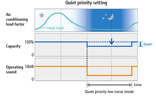L'utente può scegliere tra 4 livelli di rumorosità in funzione dell'ambiente di installazione. Il tempo di funzionamento della modalità silenziosa può essere impostato mediante il timer.
