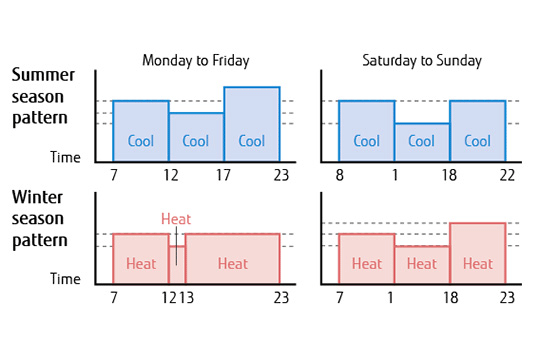 È possibile impostare fino a 4 orari di accensione/spegnimento al giorno e 2 schemi settimanali per la stagione estiva o invernale.