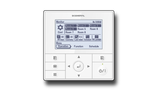 Comando di gruppo fino a 8 unità interne. La temperatura, il flusso d'aria e le impostazioni di divieto di comando locale di tutte le unità interne possono essere regolati per gruppi.