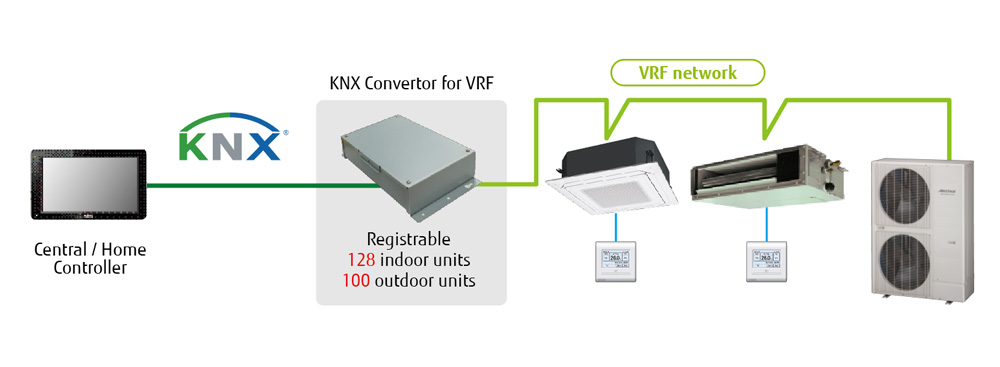 - Il convertitore KNX consente il collegamento del comando centrale/abitazione al sistema VRF Fujitsu General.