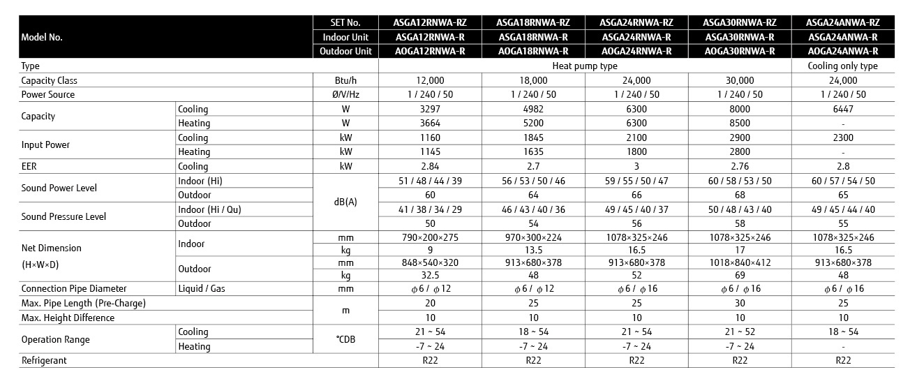 - ASGA12RNWA-R / ASGA18RNWA-R / ASGA24RNWA-R / ASGA24ANWA-R : 54℃