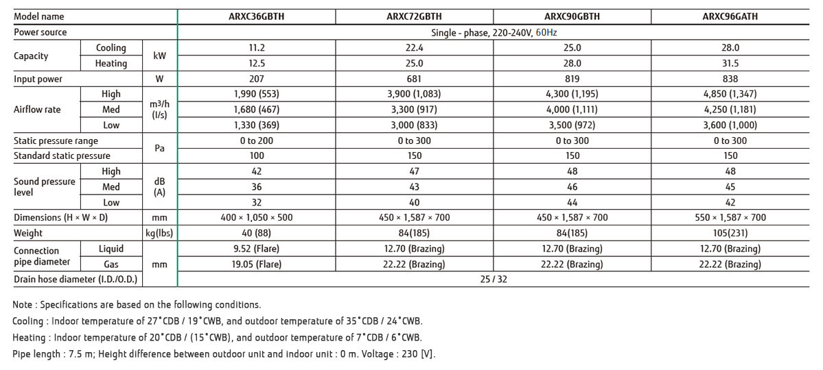 By using DC fan motor, it is possible to change static pressure range from 0 to 200Pa (ARXC36) / 300Pa (ARXC72 / 90 / 96).